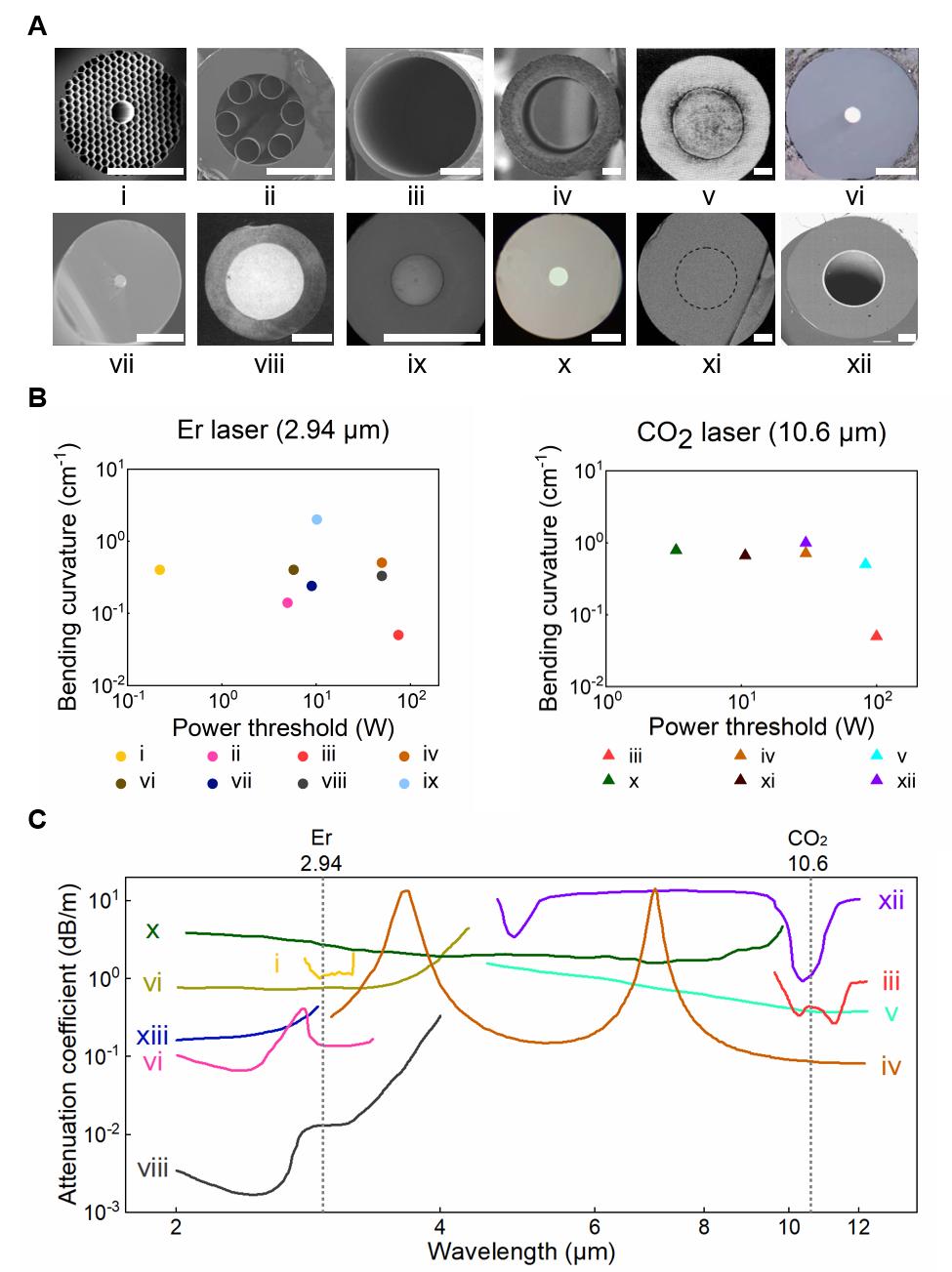 激光傳輸介質作為激光手術刀系統中的關鍵器件,需要穩定地將激光能量遞送至特定手術部位。文章系統闡述了導光臂、空心波導和紅外光纖三類主要醫用激光傳輸介質的研究現狀,并強調小尺度、高靈活性的紅外光纖器件在微創外科醫療中的應用潛力。文章全面分析了紅外光纖器件的研究進展,從激光傳輸閾值、光學損耗和機械柔性角度比較了光纖在Er激光和CO2激光中的器件性能(圖2),并指出高光學損耗和低機械強度是限制紅外光纖器件在外科手術中深度應用的關鍵因素。近年來多材料纖維技術的快速發展,不同光、力、電、磁等物理性能的復合材料高度一體化集成,為開發高柔性低損耗中紅外光纖并進一步提升手術器械功能性提供了可靠研究支撐。